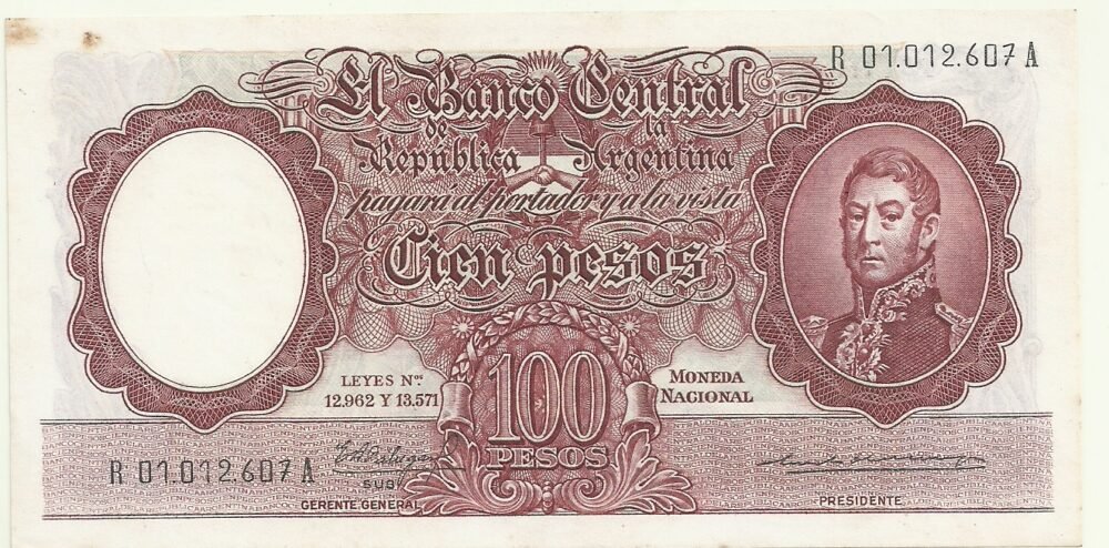 ARGENTINA 100 PESOS MONEDA NACIONAL BOT 2067 UNC C/ MANCHITA