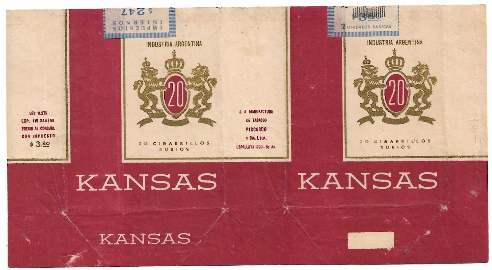 MARQUILLA KANSAS 20 CIGARRILLOS INDUSTRIA ARGENTINA SOFT  PRECIO IMPRESO $3.80
